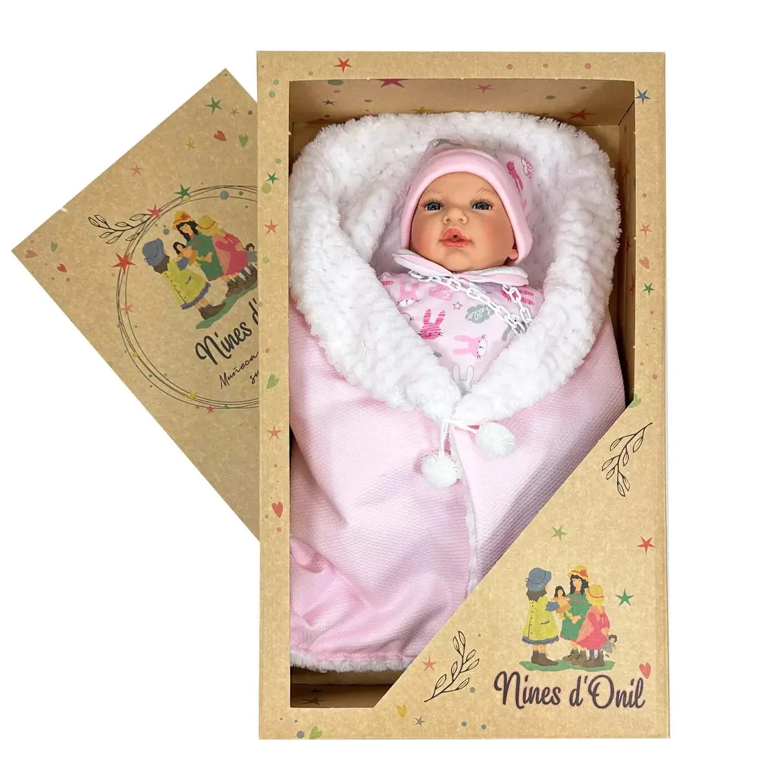BEBITO NANA is a doll that measures 45cm. It has vinyl limbs and a soft body made of hypoallergenic fabric. In this case, dressed in pink pajamas and matching hat, surrounded by a soft lullaby that, when opened, you can use it as a changing table. We love to pamper the details so that the finish is as real as possible, which is why, apart from the rosy cheeks, the eyes and lips have a realistic shine