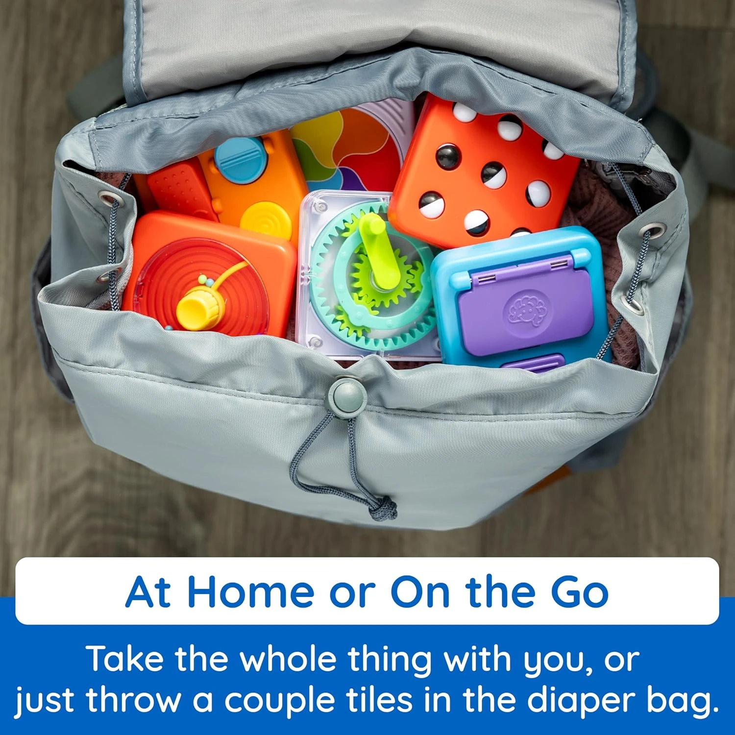 Sensory Exploration: Each tile includes unique features like spinning gears, clicking dials, and textured surfaces