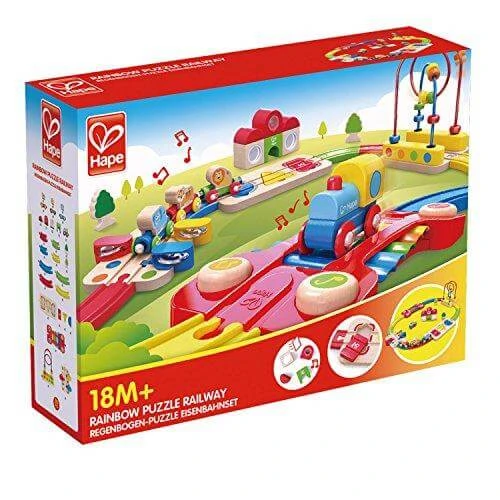 Colorful wooden railway set featuring puzzle elements like a bead maze and shape sorter 🧩