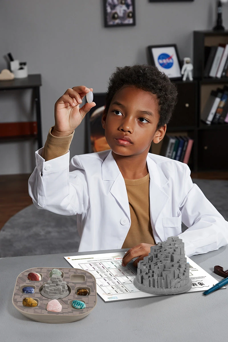 Using kid-safe tools designed for little hands, children can chip away at the excavation block to reveal 8 dazzling gemstones, just like a real archaeologist. Each gemstone has unique colours and patterns waiting to be uncovered.