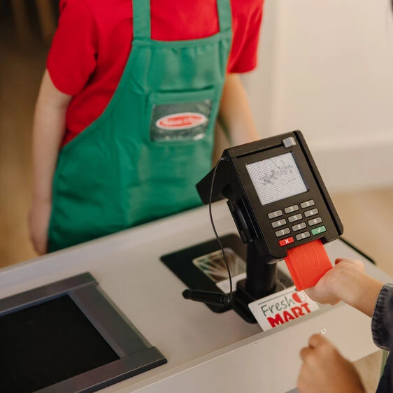 Shopping and playful purchasing is exciting at the sturdy wooden Fresh Mart Grocery Store! The free-standing play space with smooth, curved corners and edges lets customers three and older browse the shelves and pay for purchases on one side, and allows the grocer to ring up items on the other. Realistic features include beeping “scanner,” a hand-crank conveyor belt, a card-swiping machine, a keypad/calculator, and cash drawer.