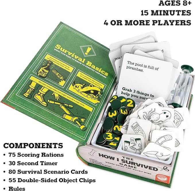 - Includes: 55 double-sided object chips, 80 survival scenario cards, 75 scoring rations, 30-second timer and instructions. For 4 or more players.