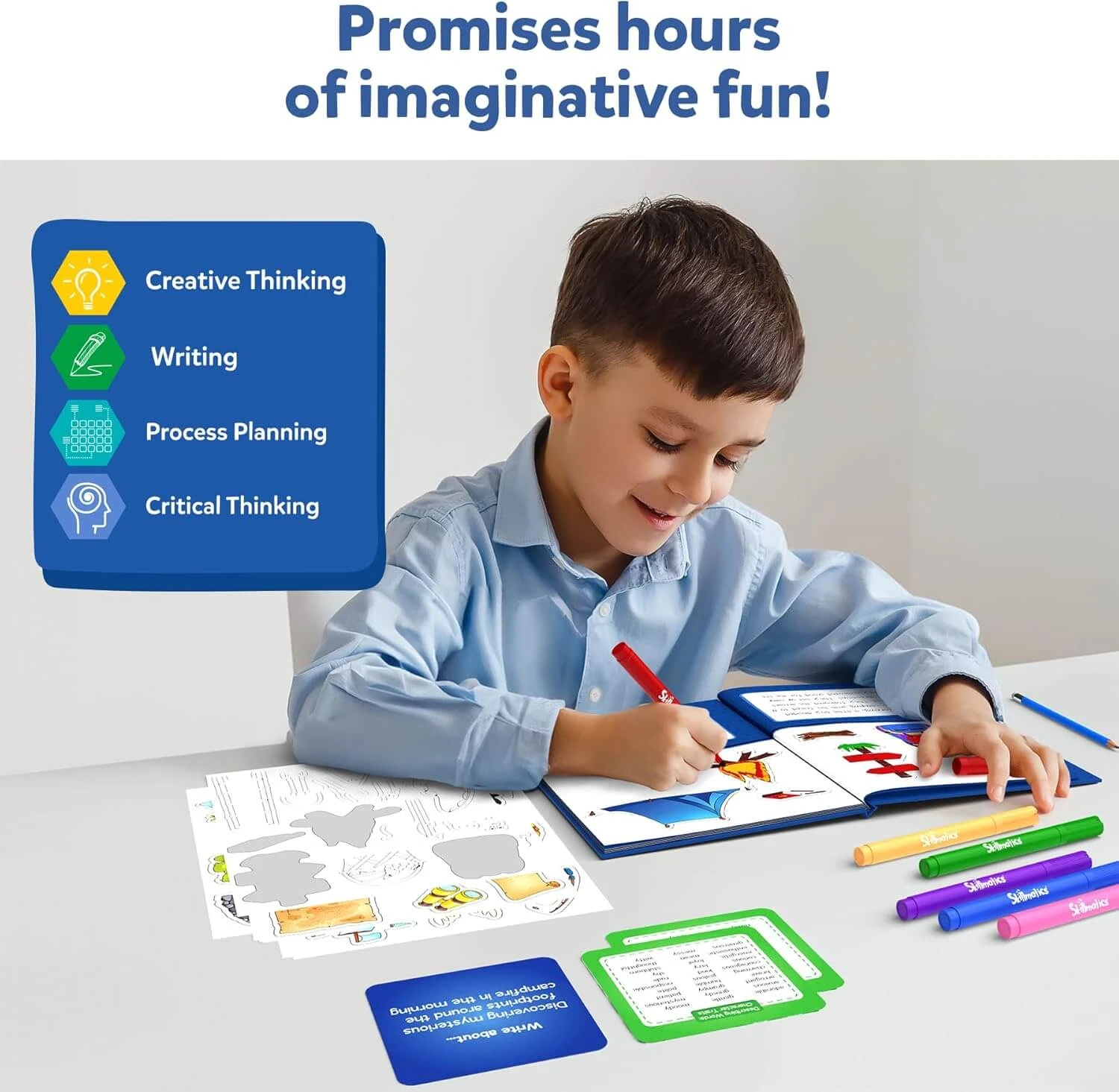 - CREATE YOUR OWN STORYBOOKS: Step into the thrilling world of adventure with Skillmatics’ Storybook Art Kit! Our kit includes everything your child needs to become an author – writing prompts, vocabulary lists, colourful stickers, markers, and hardbound books for their stories!