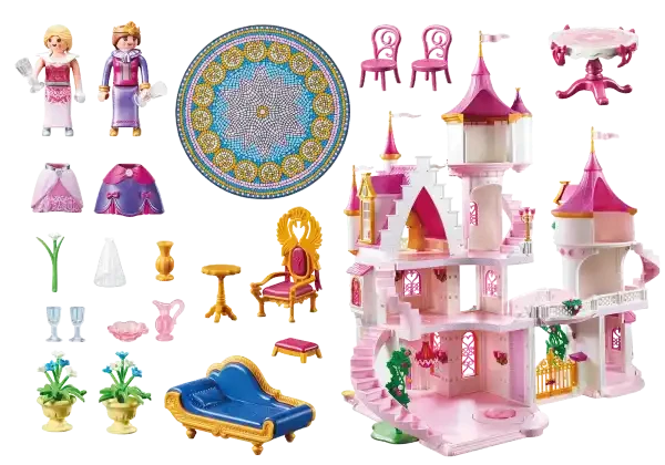 Princess Betty is a real free spirit, she is self-confident and cheerful, but unfortunately sometimes a bit clumsy. At the Princesses Academy Betty and her friends learn what it means to be a real princess. The Large Princess Castle with its many spacious rooms, towers and stairs is the ideal place for this. Betty practises dancing in the romantic throne room, cooking and baking in the kitchen and trying on clothes and accessories to her heart’s content in the dressing room. The clever princess likes to spend the end of the day reading in the tower room, or on the balcony, from where she enjoys the view of the castle garden. This princess castle is a real dream! The playset contains two PLAYMOBIL figures, a large princess castle with seven rooms, a throne room with chandelier, throne, table, carafe, glasses, chairs and vase, and an ottoman. Use the outside stairs to reach the upper floor rooms.