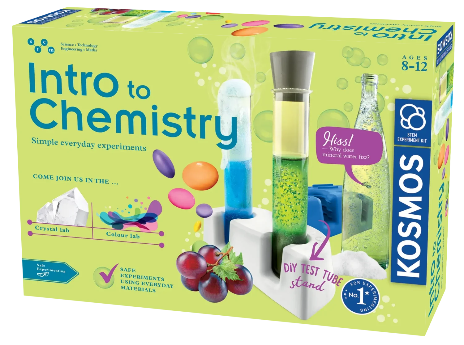 Kick off a chain reaction of fun-filled experiments with this introductory chemistry set designed specifically for young kids. Junior chemists can safely explore simple chemistry using the tools in this kit and common household substances from the kitchen and bathroom. Learn how to use basic chemistry equipment such as filters, test tubes, pipettes, and measuring spoons, and beakers. Make your own test tube racks out of plaster and learn about the chemical reaction that forms them.